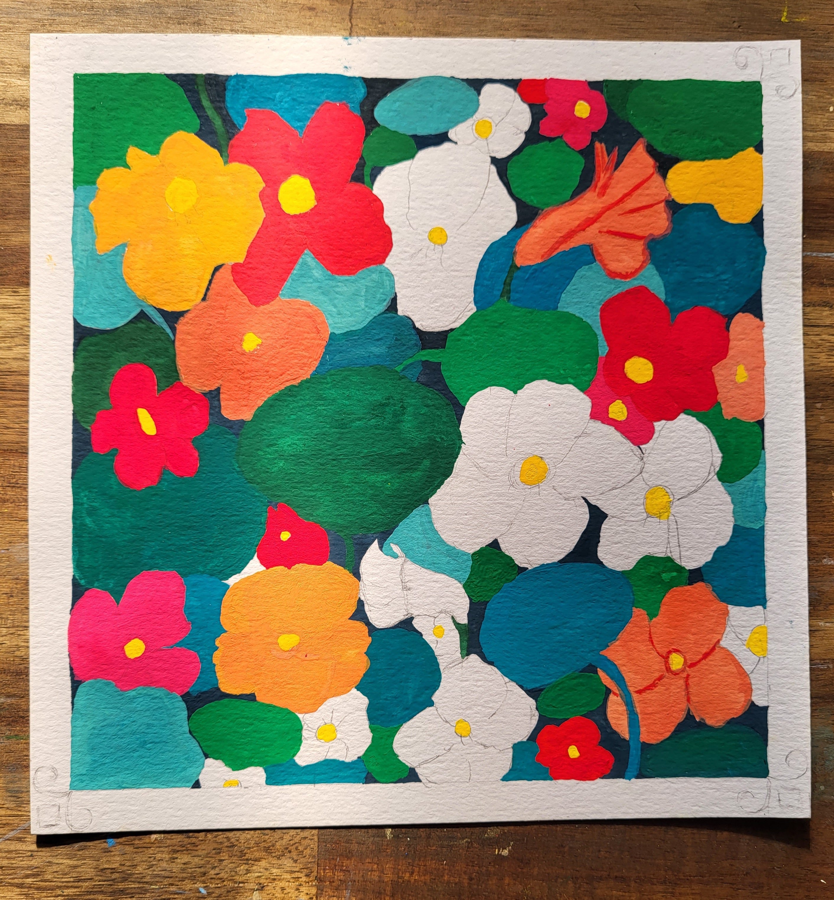 I had intended to colour in the border of this artwork with a pattern, but have since changed my mind. A mistake I have made is leaving pencil marks behind before painting… whoops.